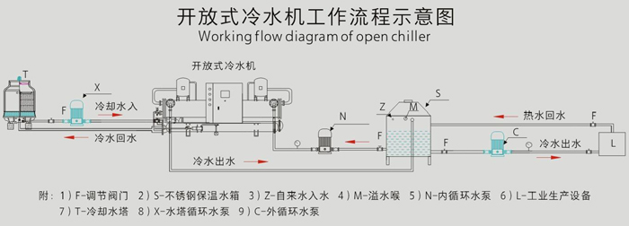 3、開放式冷水機組跟水冷式冷水機組結(jié)構(gòu)運行原理一樣,開放式需要配置一臺循環(huán)儲水箱和外循環(huán)水泵;